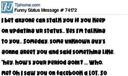 X is I bet anyone can stalk you if you keep on updating ur status.. Yes I'm talking to you.. Someday, some unknown guy's gonna greet you and said something like, "hey, how's your period goin'? ... Who, me? Oh I saw you on facebook a LOT. So just by a whim I pl