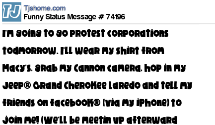 X I'm going to go protest corporations todmorrow. I'll wear my shirt from Macy's, grab my Cannon camera, hop in my Jeep® Grand Cherokee Laredo and tell my friends on facebook® (via my iPhone) to join me! (We'll be meetin up afterward at Starbucks)