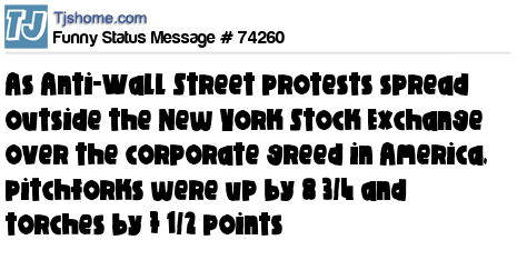X is As Anti-Wall Street protests spread outside the New York Stock Exchange over the corporate greed in America, pitchforks were up by 8 3/4 and torches by 7 1/2 points