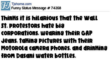 - # 74482 I think it is hilarious that the Wall St. protestors hate big corporations, carring signs made with posterboard and markers they bought at WALMART, while wearing their GAP jeans, taking pictures with their MOTOROLA or AT&T camera phones, and drinking from