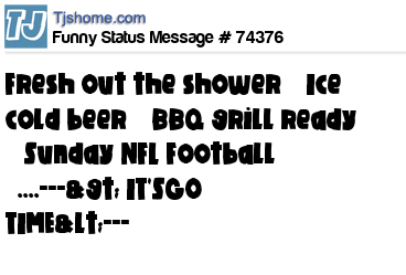 X Fresh out the shower √ Ice cold beer √ BBQ grill ready √ Sunday NFL Football √ √ √....---> IT'SGO TIME<---