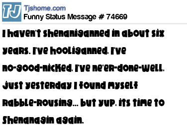 X is I haven't shenaniganned in about six years. I've hooliganned, I've no-good-nicked, I've ne'er-done-well, just yesterday I found myself rabble-rousing... but yup, its time to Shenanagin again.