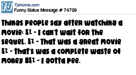 X Things people say after watching a movie: 5% - I can't wait for the sequel. 5% - That was a great movie 5% - that's was a complete waste of money 85% - I gotta pee.