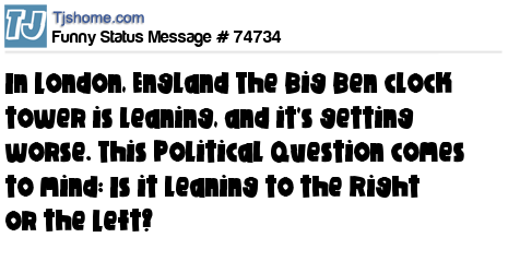 X In London, England The Big Ben clock tower is leaning, and it's getting worse. This Political Question comes to mind: Is it leaning to the Right or the Left?