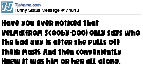 X Have you ever noticed that Velma(from Scooby-Doo) only says who the bad guy is after she pulls off their mask. And then conveniently knew it was him or her all along.