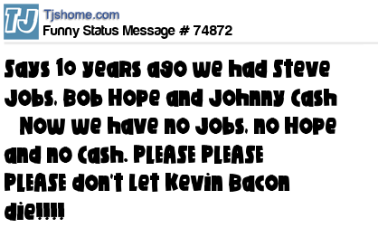 X is says 10 years ago we had Steve Jobs, Bob Hope and Johnny Cash – Now we have no Jobs, no Hope and no Cash. PLEASE PLEASE PLEASE don't let Kevin Bacon die!!!!