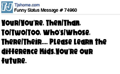 X is Your/You're, Then/Than, To/Two/Too, Who's/Whose, There/Their.... Please learn the difference kids.You're our future.