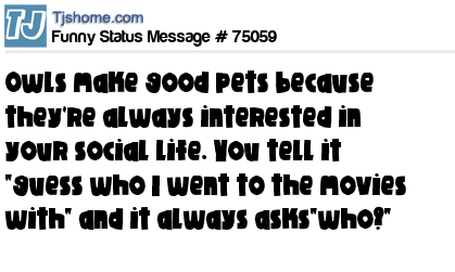 X Owls make good pets because they're always interested in your social life. You tell it "guess who I went to the movies with" and it always asks"who?"