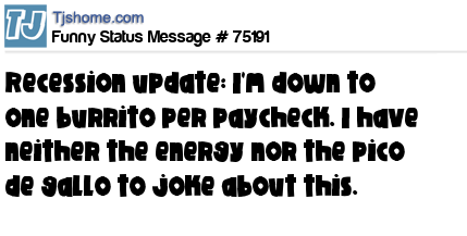 X Recession update: I'm down to one burrito per paycheck. I have neither the energy nor the pico de gallo to joke about this.