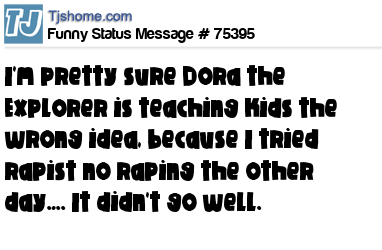 X I'm pretty sure Dora the Explorer is teaching kids the wrong idea, because I tried rapist no raping the other day…. It didn't go well.