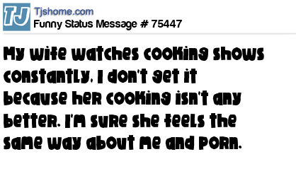 X says My wife watches cooking shows constantly, I don't get it because her cooking isn't any better. I'm sure she feels the same way about me and porn.