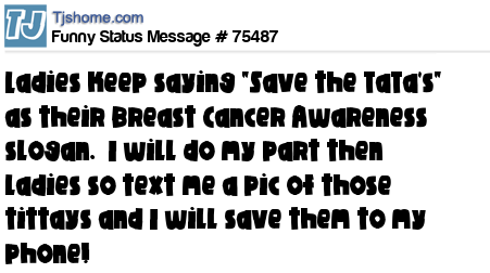 X Ladies keep saying "Save the TaTa's" as their Breast Cancer Awareness slogan. I will do my part then ladies so text me a pic of those tittays and I will save them to my phone!