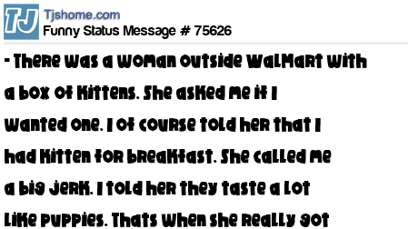 X - There was a woman outside WalMart with a box of kittens. She asked me if I wanted one. I of course told her that I had kitten for breakfast. She called me a big jerk. I told her they taste a lot like puppies. Thats when she really got mad....
