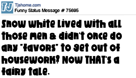 X Snow white lived with all those men & didn't once do any "favors" to get out of housework? Now THAT's a fairy tale.