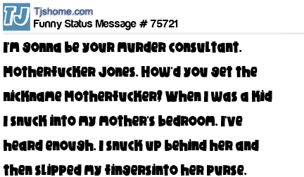 X is I'm gonna be your murder consultant. Motherfucker Jones. How'd you get the nickname Motherfucker? When I was a kid I snuck into my mother's bedroom. I've heard enough. I snuck up behind her and then slipped my fingersinto her purse. Purse, he said purse.
