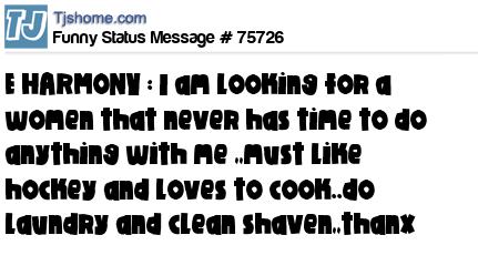 X E HARMONY : I am looking for a women that never has time to do anything with me ,,must like hockey and loves to cook..do laundry and clean shaven,,thanx