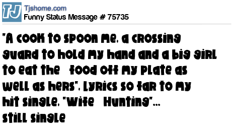 X is "A cook to spoon me, a crossing guard to hold my hand and a big girl to eat the food off my plate as well as hers", Lyrics so far to my hit single, "Wife Hunting"... still single
