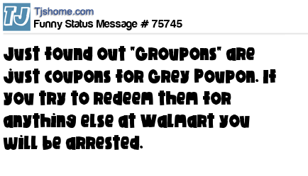 X Just found out "Groupons" are just coupons for Grey Poupon. If you try to redeem them for anything else at Walmart you will be arrested.