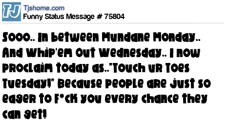 X is Sooo.. In between Mundane Monday.. And Whip'em Out Wednesday.. I now proclaim today as.."Touch ur Toes Tuesday!" Because people are just so eager to F*ck you every chance they can get!