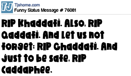 X is RIP Khaddafi. Also, RIP Qaddafi. And let us not forget: RIP Ghaddafi. And just to be safe, RIP Caddaphee.