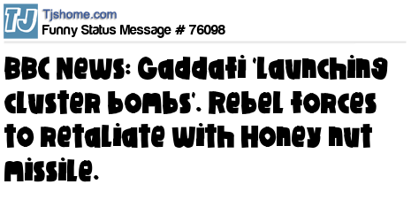 X BBC News: Gaddafi 'launching cluster bombs'. Rebel forces to retaliate with Honey nut missile.