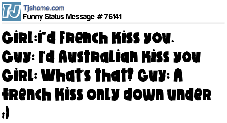 X Girl:i"d French kiss you. Guy: I'd Australian kiss you Girl: What's that? Guy: A french kiss only down under ;)