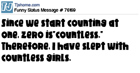 X Since we start counting at one, zero is"countless." Therefore, I have slept with countless girls.