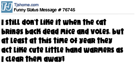 X is I still don't like it when the cat brings back dead mice and voles, but at least at this time of year they act like cute little hand warmers as I clear them away!