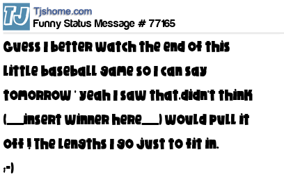 X says Guess I better watch the end of this little baseball game so I can say tomorrow ' yeah I saw that,didn't think (___insert winner here___) would pull it off ! The lengths I go just to fit in. ;-)