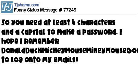 X so you need at least 4 characters and a Capital to make a password. I hope I remember DonaldDuckMickeyMouseMineyMouseGoofyParis to log onto my emails!