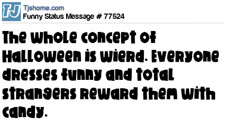 X is The whole concept of Halloween is wierd. Everyone dresses funny and total strangers reward them with candy.