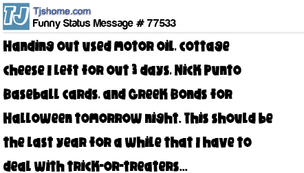 X is handing out used motor oil, cottage cheese I left for out 3 days, Nick Punto Baseball cards, and Greek Bonds for Halloween tomorrow night. This should be the last year for a while that I have to deal with trick-or-treaters...