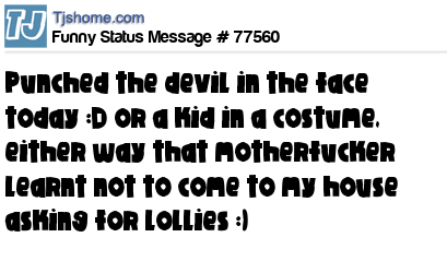 X punched the devil in the face today :D or a kid in a costume, either way that motherfucker learnt not to come to my house asking for lollies :)