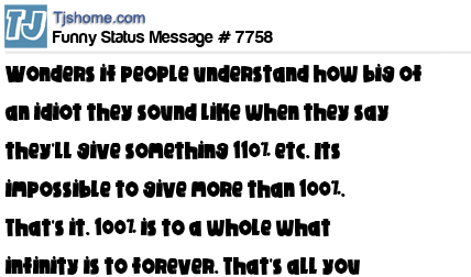 X wonders if people understand how big of an idiot they sound like when they say they'll give something 110% etc. Its impossible to give more than 100%. That's it. 100% is to a whole what infinity is to forever. That's all you get.