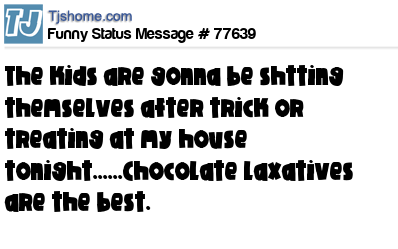 X says The kids are gonna be shtting themselves after trick or treating at my house tonight......Chocolate laxatives are the best.