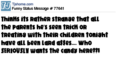 X thinks its rather strange that all the parents he's seen trick or treating with their children tonight have all been lard a$$es.... Who SERIOUSLY wants the candy here??!