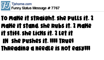 - # 178046 To make it stand, you wet it. To make it wet, you suck it. To make it stiff, you lick it. To get it in, you push it. Threading a needle isn't easy.