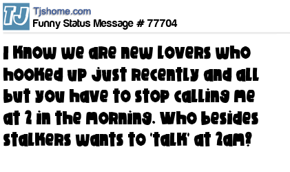 X says I know we are new lovers who hooked up just recently and all but you have to stop calling me at 2 in the morning. Who besides stalkers wants to 'talk' at 2am?