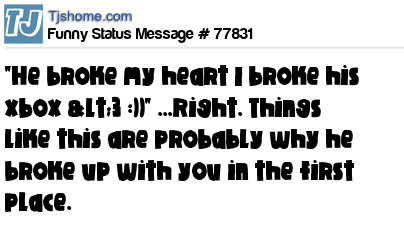 X "He broke my heart I broke his xbox <3 :))" ...Right. Things like this are probably why he broke up with you in the first place.