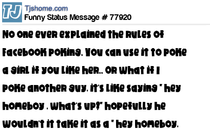 X No one ever explained the rules of Facebook poking. You can use it to poke a girl if you like her.. Or what if I poke another guy, it's like saying " hey homeboy , what's up?" hopefully he wouldn't it take it as a " hey homeboy, what's up buttercup :)"