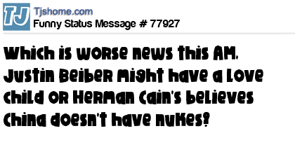 X is Which is worse news this AM, Justin Beiber might have a love child or Herman Cain's believes China doesn't have nukes?