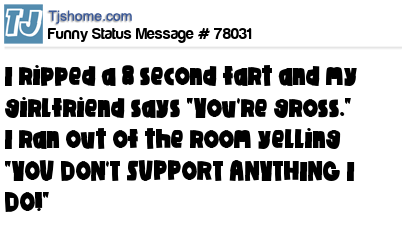 X I ripped a 8 second fart and my girlfriend says "You're gross." I ran out of the room yelling "YOU DON'T SUPPORT ANYTHING I DO!"