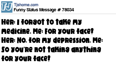 X Her: I forgot to take my medicine. Me: For your face? Her: No, for my depression. Me: So you're not taking anything for your face?