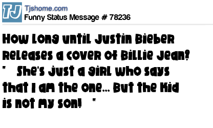 X How long until Justin Bieber releases a cover of Billie Jean? "♫ She's just a girl who says that I am the one... But the kid is not my son! ♫"