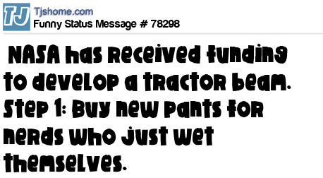 X NASA has received funding to develop a tractor beam. Step 1: Buy new pants for nerds who just wet themselves.