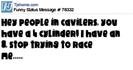 X is Hey people in cavilers, you have a 4 cylinder! I have an 8, stop trying to race me.....
