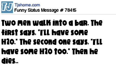 - # 78417 Two men walk into a bar. The first says, "I'll have some H2O." The second one says, "I'll have some H2O too." Then he dies