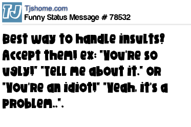 X Best way to handle insults? Accept them! ex: "You're so ugly!" "Tell me about it." or "You're an idiot!" "Yeah, it's a problem..".