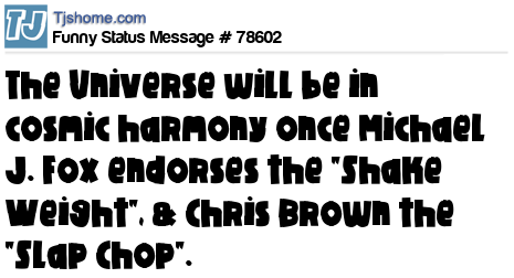 X says The Universe will be in cosmic harmony once Michael J. Fox endorses the "Shake Weight", & Chris Brown the "Slap Chop".