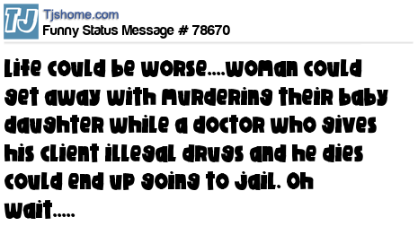 X Life could be worse....woman could get away with murdering their baby daughter while a doctor who gives his client illegal drugs and he dies could end up going to jail. Oh wait.....